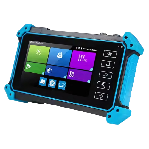 Comprehensive camera and cable tester with high resolution display, HD tests, ONVIF support, Wi-Fi, power output, and advanced network tools.