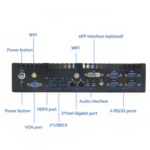 Compact Embedded Desktop Computer featuring Intel H310 chipset, support for 8th Gen Intel Core processors, 32GB RAM, HDMI/VGA/eDP display option.