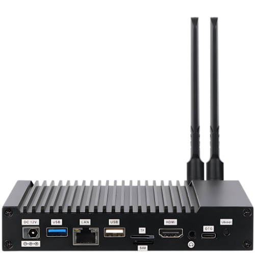 Compact device with RK3368 CPU, 1GB RAM, 16GB eMMC, 6 USB 2.0 ports, 2 RS-232 (1 RS-485). Size: 6.18 x 4.92 x 1.10 in (157 x 125 x 28mm)