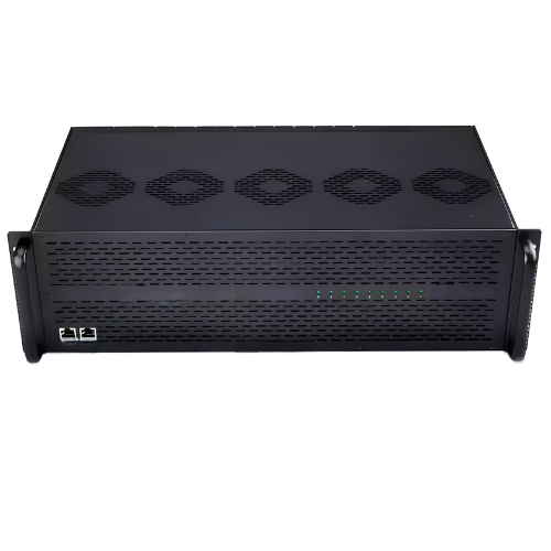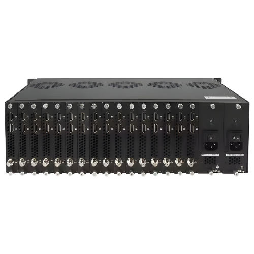 Asset Track Pro multi IP video converter with channel configuration s a 4RU rack mounted chassis that allows for installation of up to 16 pieces high quality SAW filtered frequency agile modulators covering 860MHz. Built in active combiner eliminates unnecessary cabling and potential connection problem and ensures a high output level. Low out of band noise makes it ideal in adjacent channel headend.