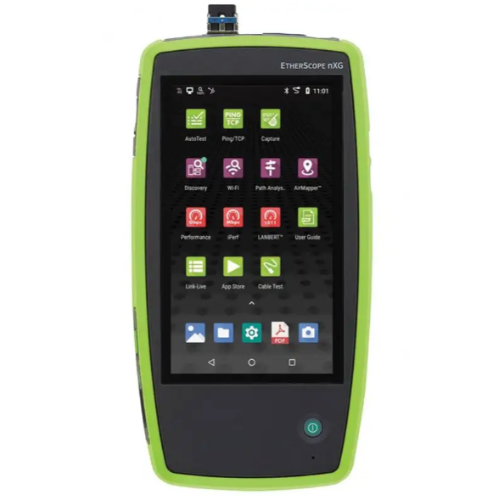Portable network analyzer with advanced features for Ethernet and traffic monitoring. Compact design, touchscreen display, and rechargeable battery